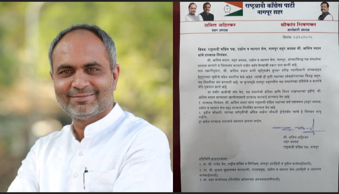 नागपूर : परखड मत व्यक्त केल्याप्रकरणी राष्ट्रवादी काँग्रेस पक्षाचे व्यापारी व उद्योग विभागाचे विदर्भ प्रदेश अध्यक्ष आशिष मदान यांच निलंबन करण्यात आलं आहे. नागपूर शहर अध्यक्ष अनिल अहिरकर यांनी त्यांच निलंबन केल असून ते बेकायदेशीर आहे.